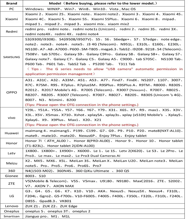 1) This camera only works with some Android phones ONLY that supports OTG function and external cameras (both conditions are required).