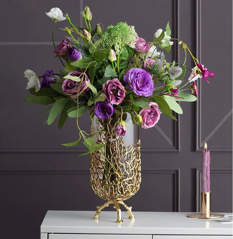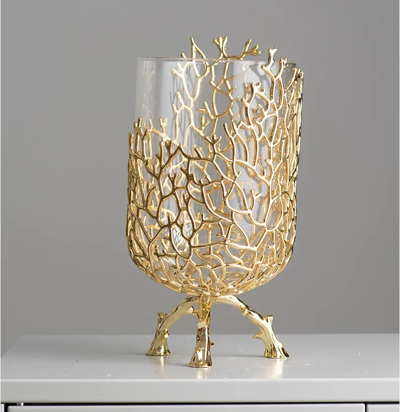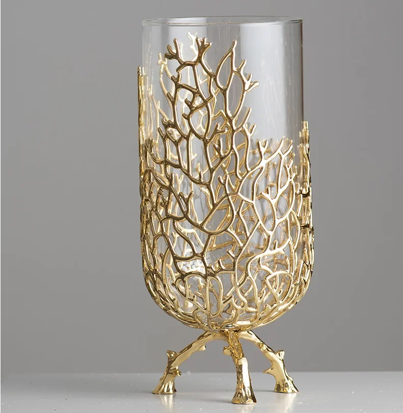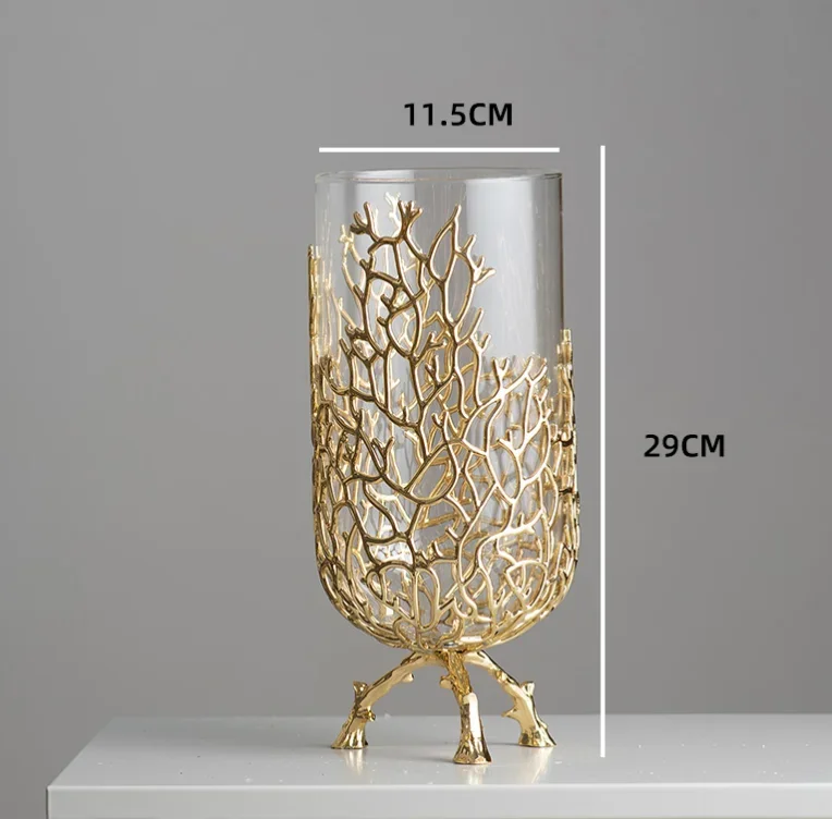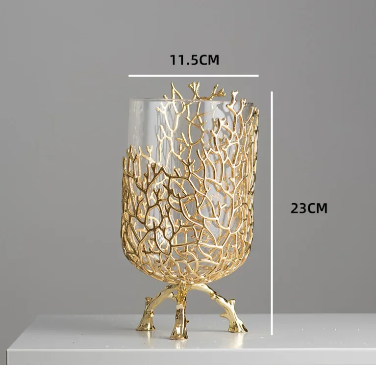 Gold Hollow Coral Vase Transparent Glass Vase Ornament Metal Rack Living Room Hydroponic Flower Arrangement Home Decoration